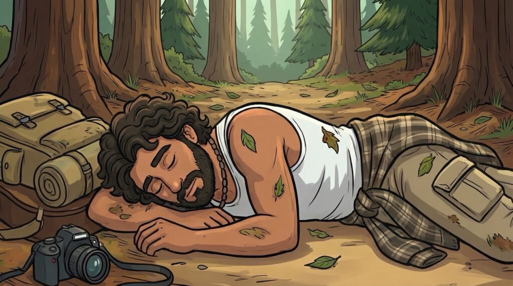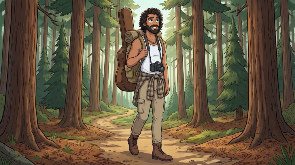 El sol de la tarde se filtraba entre las copas de los pinos, bañando el camino de tierra con una luz dorada y vacilante. Alexander caminaba con paso rítmico, sintiendo el peso familiar de su guitarra al hombro y la cámara golpeando suavemente contra su pecho; aquel pueblo, hundido en el silencio de las montañas, parecía el refugio perfecto para su espíritu errante.