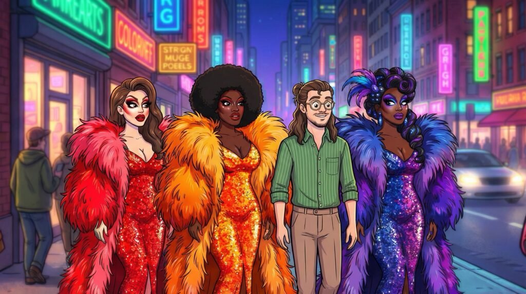 Caminaron juntos por la avenida principal, formando un grupo de lo más pintoresco: el profesor rural de cabello largo y anteojos rodeado de divas de metro noventa. Las Drags no paraban de bromear con él, burlándose con cariño de su lenguaje educado y su asombro ante las luces de la ciudad, haciéndolo reír por primera vez en días.