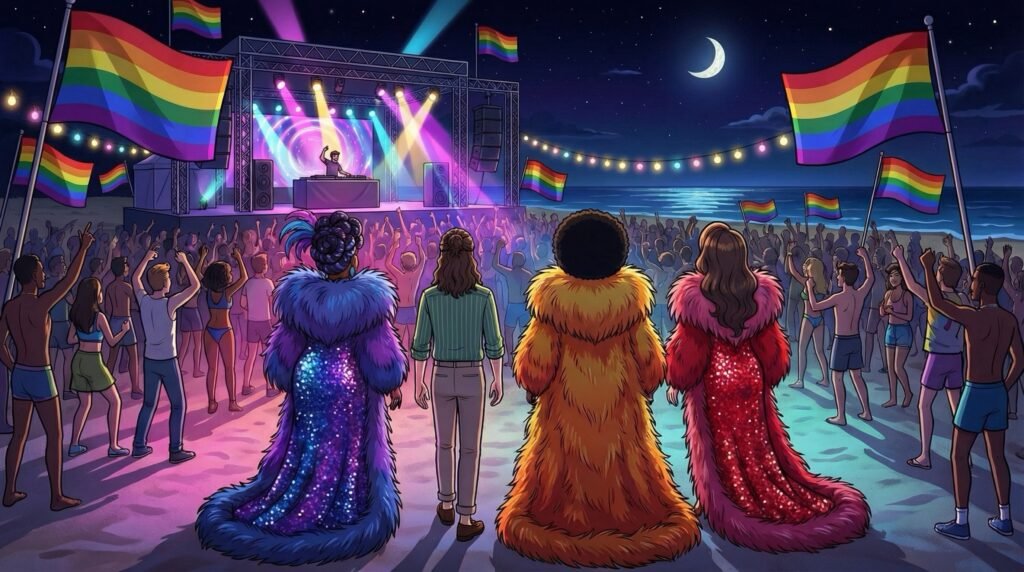 Al llegar a la playa, el espectáculo era abrumador: una marea de gente diversa bailaba bajo una lluvia de luces de colores, con la música vibrando en la arena y el mar rugiendo de fondo. Había banderas de arcoíris por todos lados, y Juan sintió un nudo en la garganta al comprender que no estaba solo en el mundo, que existían miles como él.