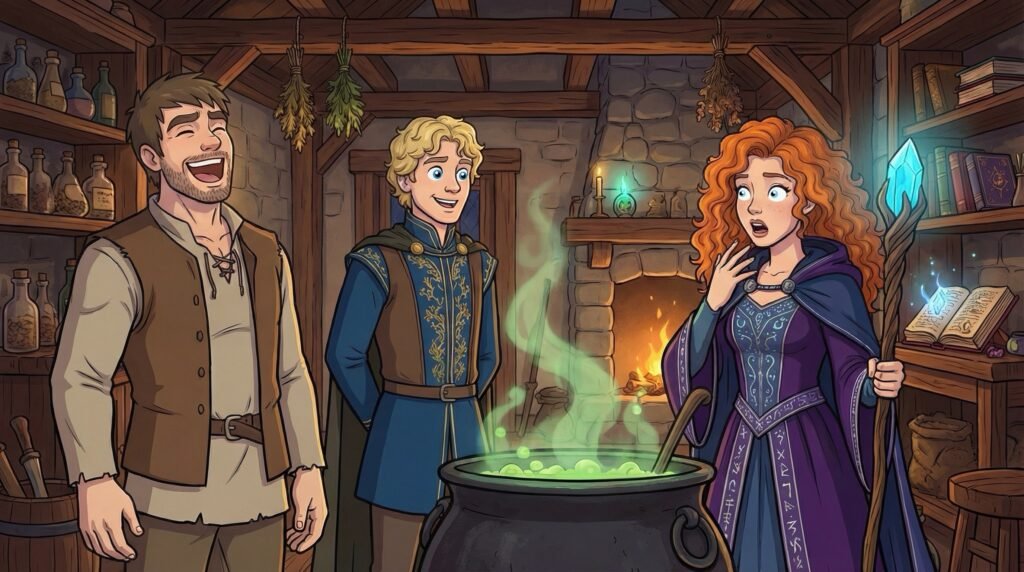 —¿No era que nos estabas esperando? —dijo Diego entre carcajadas, disfrutando de la reacción de su amiga y del desconcierto del príncipe. Matilde se recuperó rápidamente del impacto y saludó a Agustín con una inclinación de cabeza menos formal de lo que el protocolo exigiría, pero llena de amabilidad. Diego se puso serio y explicó la situación: necesitaban una poción poderosa para cambiarle el aspecto al príncipe, pues este quería salir de aventura y cruzar el mar sin que nadie en el reino lo reconociera por su rostro.