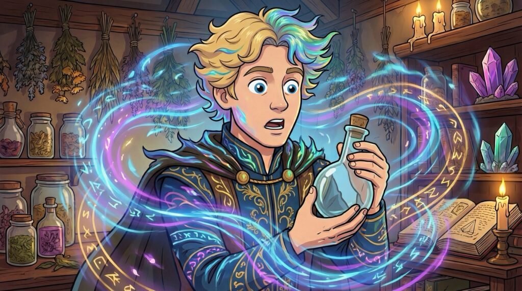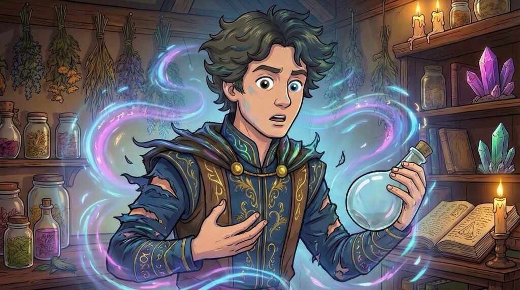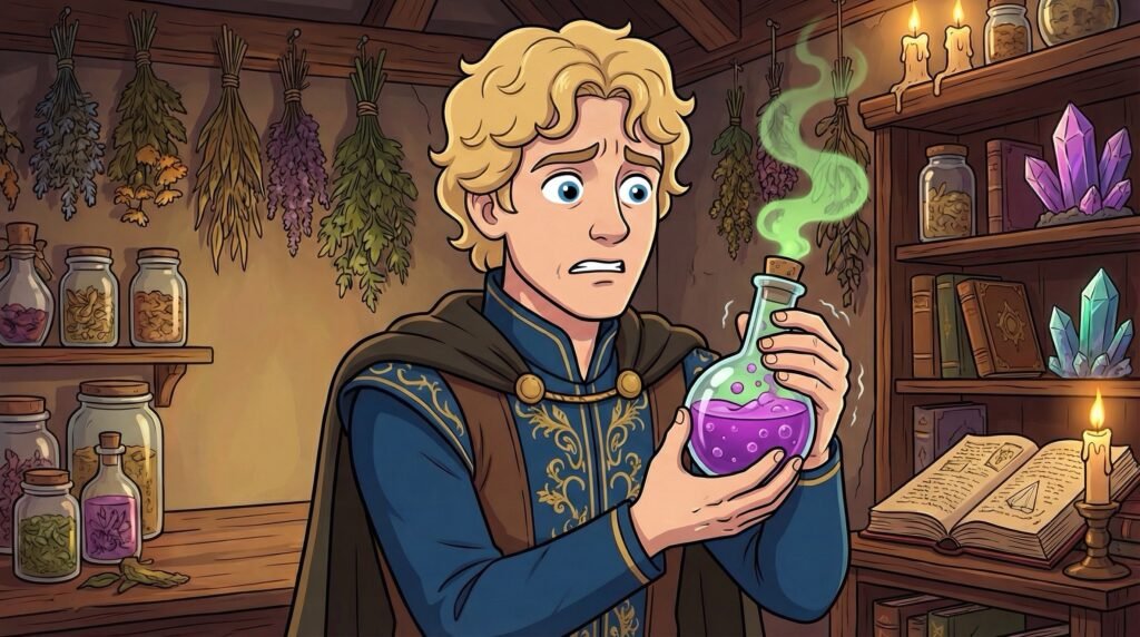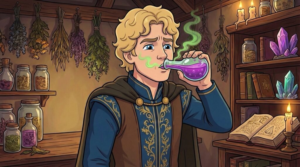 Finalmente la poción estuvo lista, un líquido de color violeta que burbujeaba suavemente en una pequeña botella de cristal. Se la dieron al príncipe, el cual estaba visiblemente aterrado ante la idea de ingerir algo fabricado en un bosque, pero estaba dispuesto a seguir con su plan a cualquier costo. Agustín tomó aire, cerró los ojos y bebió la pócima de un solo trago, sintiendo un calor súbito que recorría cada rincón de su cuerpo, desde la punta de los pies hasta la raíz de su cabello.