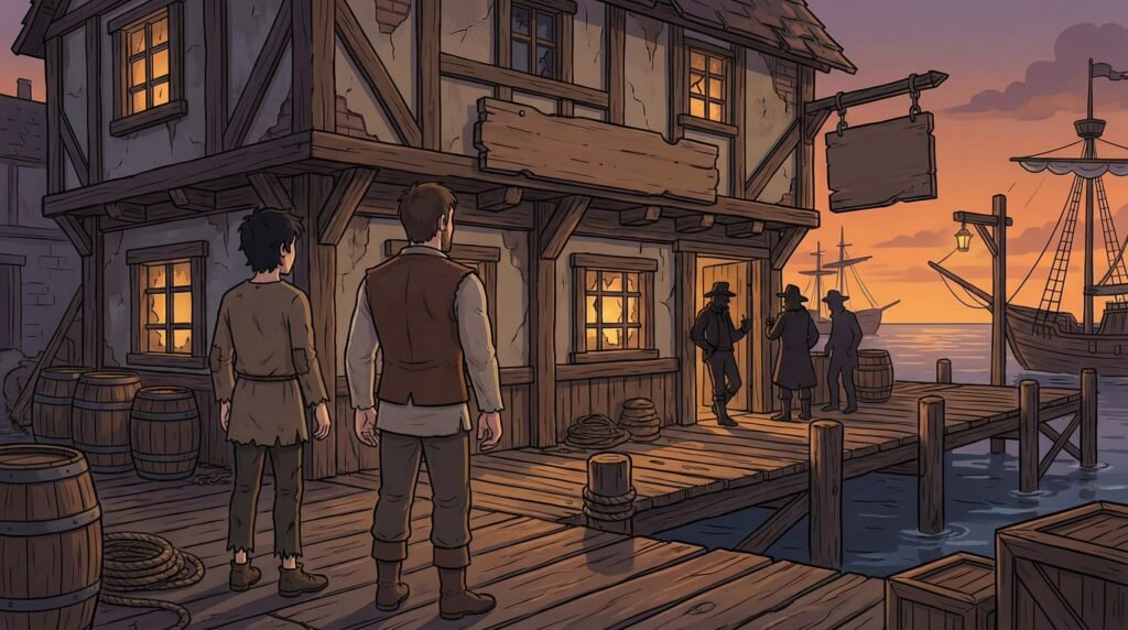 Al llegar al puerto, el bullicio era ensordecedor: gritos de estibadores, chirridos de poleas y el graznido de las gaviotas llenaban el ambiente. Se dirigieron directamente a un bar de aspecto rudo y desgastado cerca del muelle, un lugar en donde Diego decía que podrían encontrar a un viejo amigo que los podría ayudar a cruzar el mar. Agustín sentía un nudo en el estómago; a pesar de su disfraz, la idea de entrar en un antro frecuentado por gente de mar lo ponía nervioso, pero confiaba plenamente en el juicio del campesino.