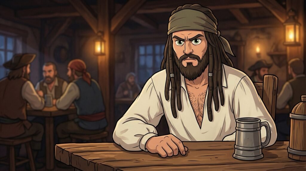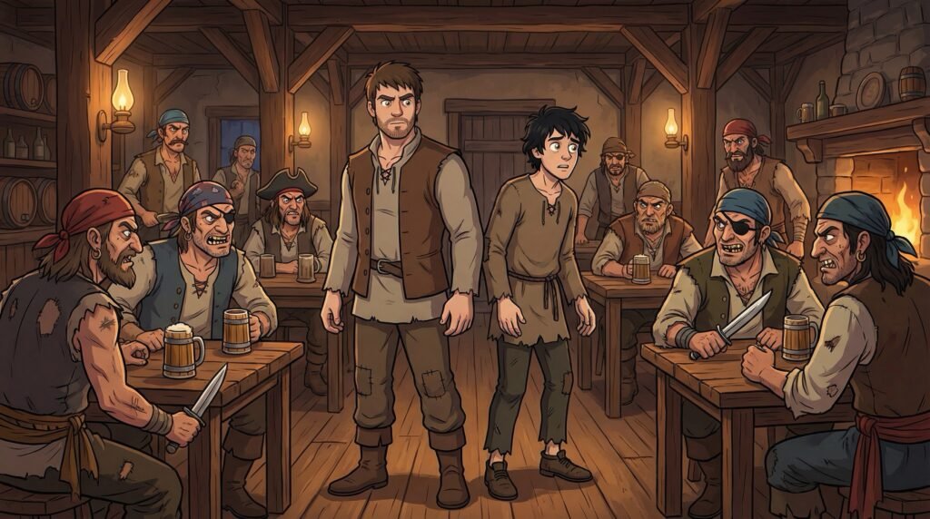 Al entrar, la luz era escasa y el aire estaba cargado de humo de tabaco y el olor rancio de la cerveza barata. Agustín pudo ver que el bar estaba lleno de piratas y marineros de mala vida, con rostros curtidos por el sol y cicatrices que hablaban de mil batallas. Ver a hombres con parches en los ojos y espadas al cinto lo hizo estremecerse de miedo, haciéndole comprender que el mundo fuera del castillo no solo era fascinante, sino también extremadamente peligroso para alguien que no sabía defenderse en la calle.