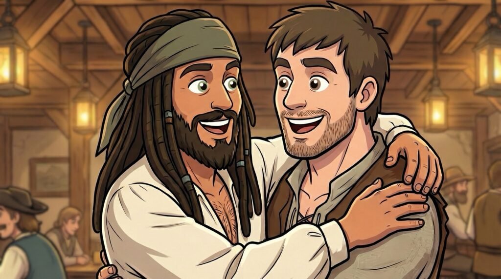 —¡Amigo mío! ¡Cuánto tiempo sin verte! —exclamó Valerius con una voz atronadora que hizo vibrar las jarras de la mesa—. ¿Qué te trae por aquí después de tantos años de silencio? El capitán abrazó a Diego con tal fuerza que los pies del campesino casi se despegaron del suelo, mientras los demás piratas relajaban su postura al ver que los intrusos eran bienvenidos por su líder. Agustín observaba la escena con ojos muy abiertos, asombrado por la red de contactos que un simple trabajador de la tierra podía poseer.