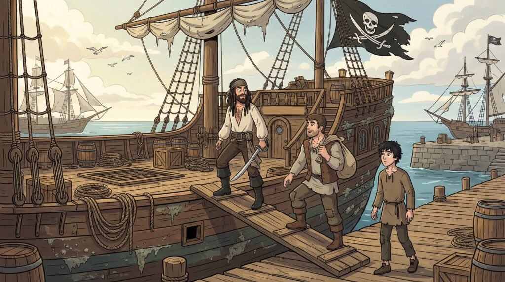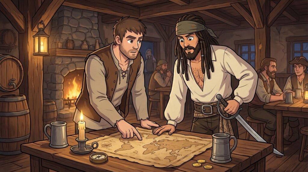 El pirata escuchó la historia con atención, pasando sus dedos callosos sobre los trazos del pergamino real con una reverencia que Agustín no esperaba de un forajido. Valerius, a pesar de su reputación sangrienta, era un hombre que valoraba la lealtad y el amor familiar por encima del oro. Conmovido por la historia de su viejo amigo y por la audacia de la misión, el capitán golpeó la mesa con el puño y decidió ayudarlos en su travesía, prometiendo que esa misma tarde partirían en su barco hacia el horizonte.
