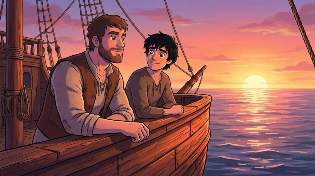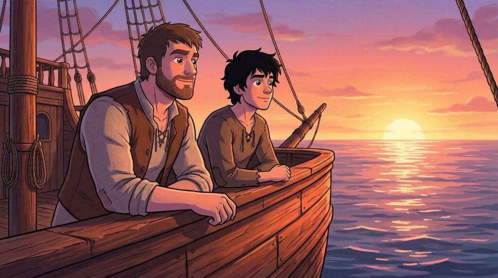 Ya en altamar, el príncipe Agustín contemplaba el atardecer desde la popa con una expresión melancólica que no podía ocultar ni con su disfraz mágico. La brisa del mar acariciaba su rostro, ahora diferente por la pócima, y el sonido del agua golpeando el casco le proporcionaba un ritmo hipnótico para sus pensamientos. Se sentía como una hoja arrastrada por la corriente, lejos de los muros de piedra que habían definido su existencia desde el día en que nació.