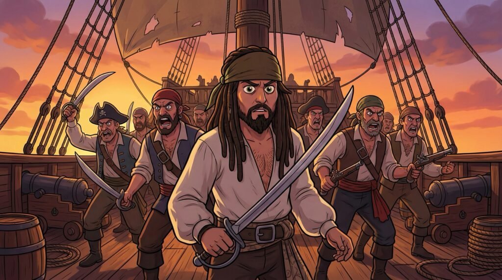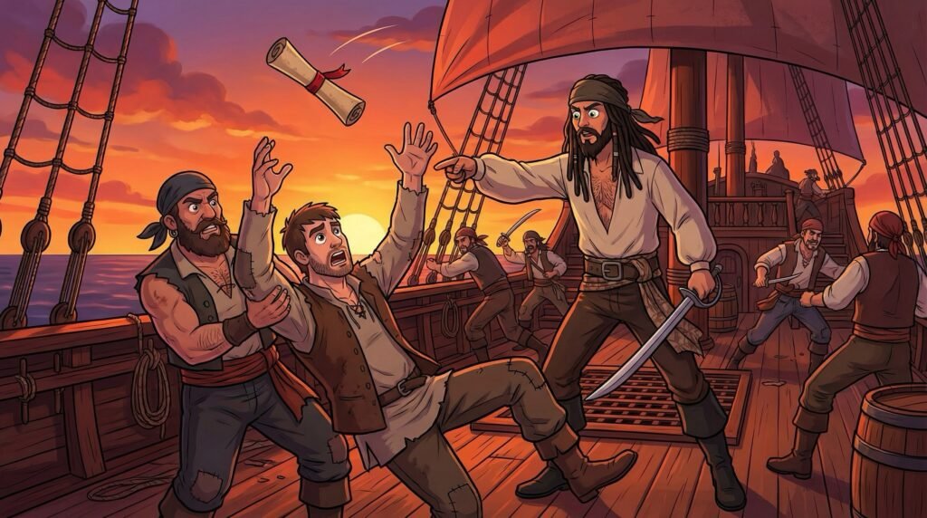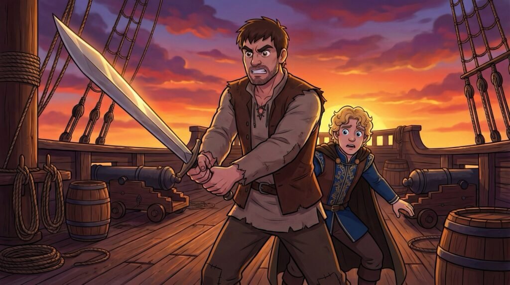 Sin mapa, sin disfraz y superados en número por una tripulación que veía en ellos una fortuna andante, la lucha de Diego fue valiente pero inútil. Los piratas los redujeron rápidamente, usando la fuerza bruta de sus manos curtidas para desarmar al campesino y someter al príncipe. Agustín miraba con horror cómo el mapa desaparecía entre las olas, sintiendo que su última esperanza de libertad y la vida de la hija de Diego se hundían para siempre en la oscuridad del océano.