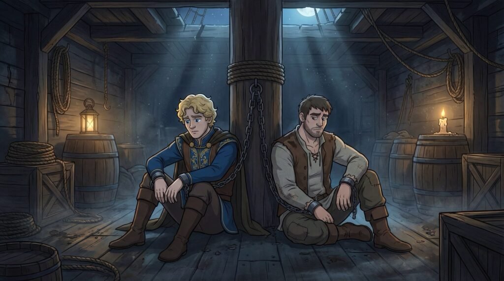 Finalmente, Diego y Agustín terminaron encadenados a un poste de madera en la parte baja del barco, secuestrados por los mismos hombres en los que habían confiado. La fiesta se había convertido en una guardia estricta, y el barco continuaba su rumbo bajo un cielo que amenazaba con una tempestad destructora. Atados el uno al otro, los dos hombres se quedaron en la penumbra de la bodega, escuchando cómo los piratas celebraban su captura mientras el mundo exterior se volvía cada vez más violento.