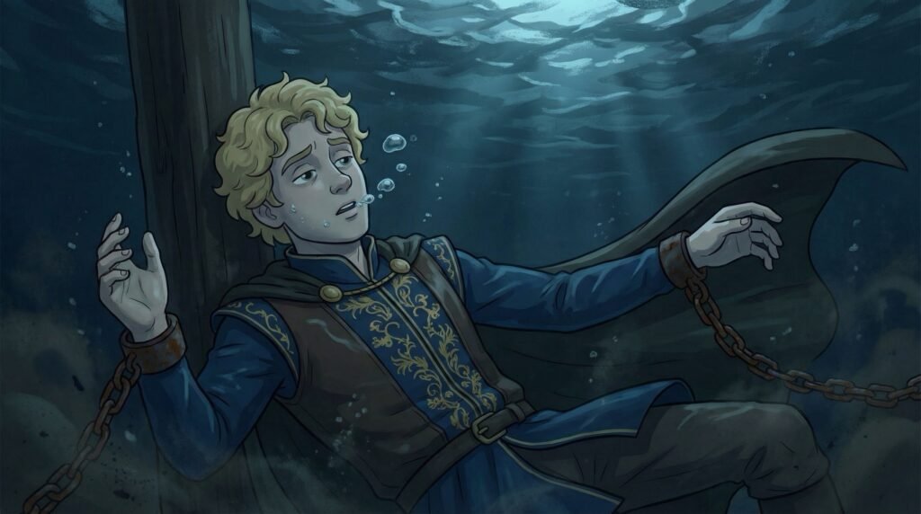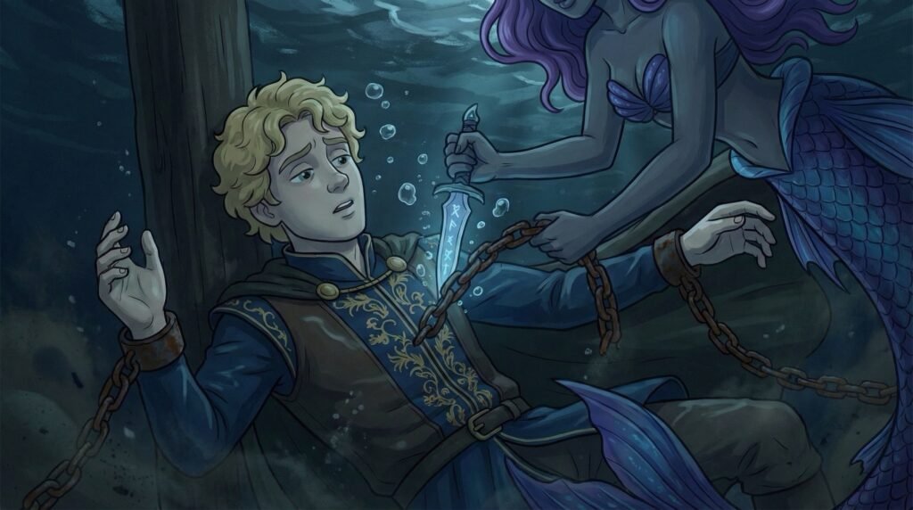 Pero el destino aún no había terminado con ellos. En medio de la negrura absoluta, cuando la vida se les escapaba, unas manos de tacto frío pero gentil los sujetaron. Unas figuras gráciles, con colas que brillaban con luz propia, emergieron de las sombras del arrecife. Las sirenas, guardianas de los secretos del mar, se acercaron a los cuerpos inertes. Con una fuerza sobrenatural y casi mágica, cortaron los eslabones de hierro, rompiendo las cadenas de los piratas como si fueran simples hilos de seda.