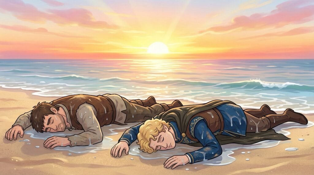 Las criaturas marinas, movidas por un propósito antiguo, comenzaron a impulsarlos hacia la superficie, lejos de los restos del naufragio. Agustín y Diego, inconscientes y flotando en la ingravidez del agua, eran llevados por la corriente que las sirenas generaban con sus colas. El mar, que hace unos momentos parecía su tumba, se convirtió en el camino hacia una salvación inesperada. Las guardianas del océano los depositaron con cuidado en una orilla lejana antes de desaparecer nuevamente en las profundidades.