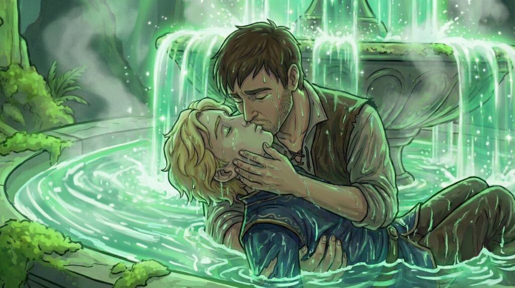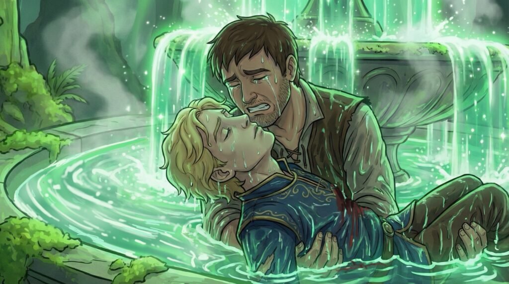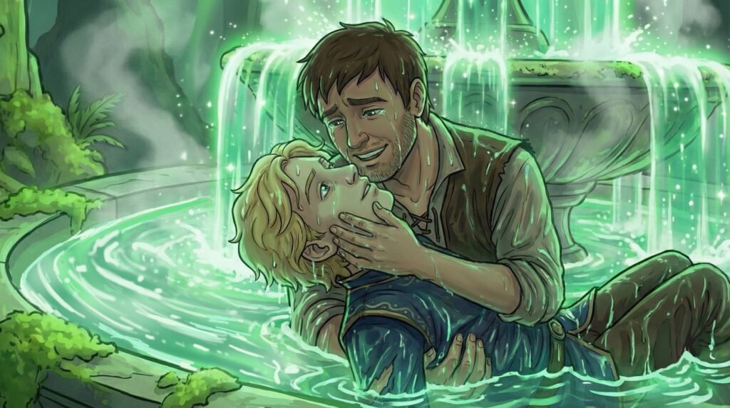 Diego caminó como pudo hasta el borde de la fuente, sintiendo la energía que vibraba en el agua sanadora. Sin dudarlo un segundo, entró en el estanque abrazando a Agustín, sumergiéndose ambos en las aguas mágicas que prometían curar lo incurable.