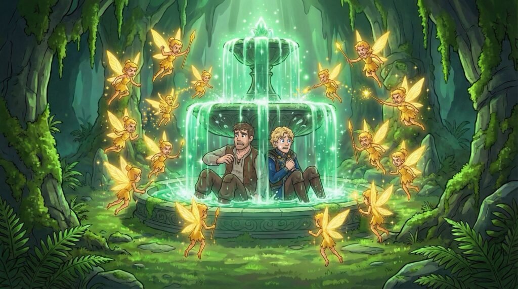 Las hadas, guardianas de la fuente, se movían con una velocidad cegadora, rodeando a los intrusos con estelas de luz plateada. Diego y Agustín intentaron explicar su presencia, pero las pequeñas criaturas parecían no querer escuchar razones hasta que una de ellas se detuvo frente al príncipe. El hada lo observó detenidamente, reconociendo en sus facciones el gran parecido con su padre y con los ancestros de la familia real que habían visitado la isla en siglos pasados.