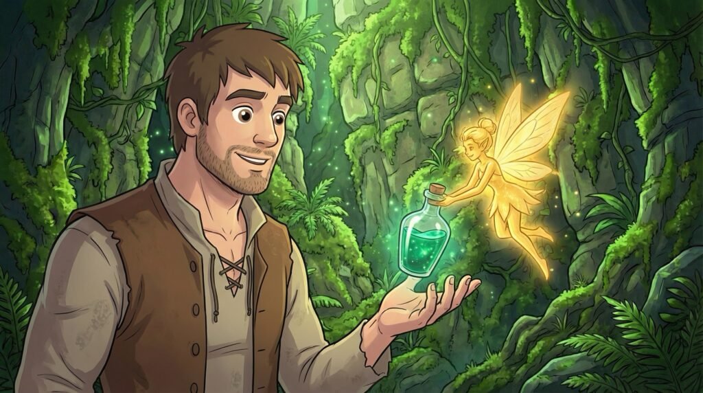 La paz volvió a la caverna mientras las hadas revoloteaban amistosamente alrededor de la pareja, maravilladas por la lealtad que unía a un príncipe y a un campesino. Al terminar la charla, la líder de las hadas voló hacia una flor de cristal y recogió un poco del elixir más puro en un pequeño frasco de vidrio que entregó solemnemente a Diego. Con el medicamento sagrado finalmente en sus manos, Diego sintió que su misión estaba cumplida, y las hadas se despidieron deseándoles un viaje seguro de regreso a su hogar.