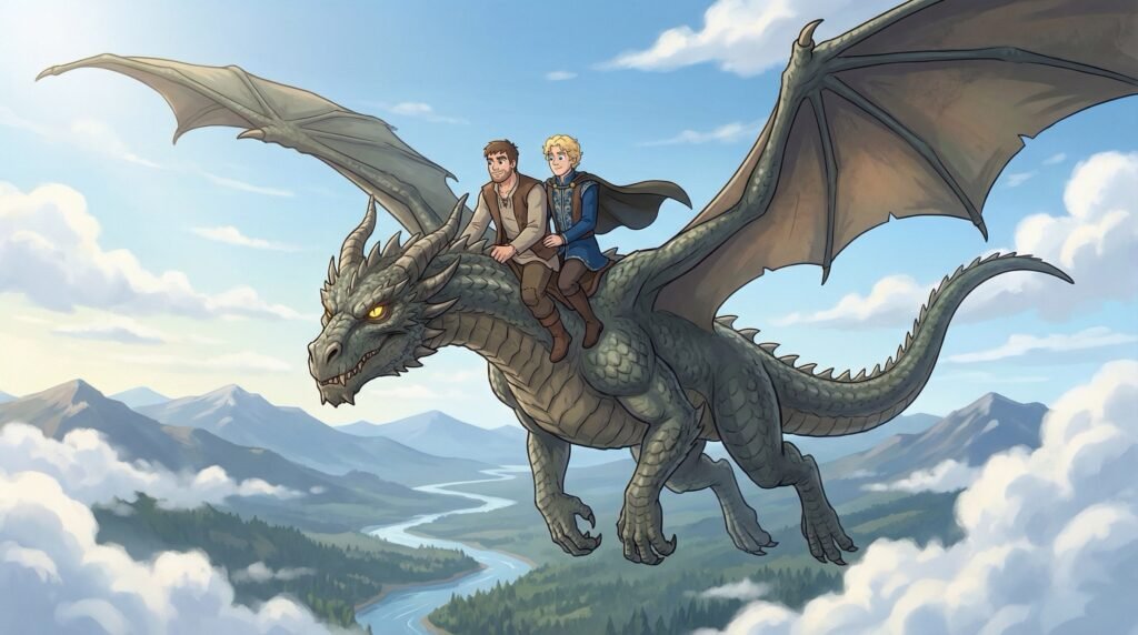 El regreso no fue en barco ni a pie, pues el dragón, ya recuperado de sus heridas y entendiendo que Agustín era un aliado de las hadas, se ofreció a llevarlos. Fue el propio dragón quien los llevó volando en su lomo a través del vasto océano, batiendo sus alas con una fuerza que hacía que el viaje de días se redujera a horas. Agustín y Diego se abrazaban con fuerza a las escamas de la bestia, viendo las nubes pasar bajo sus pies y sintiendo la libertad absoluta de volar sobre el mundo.
