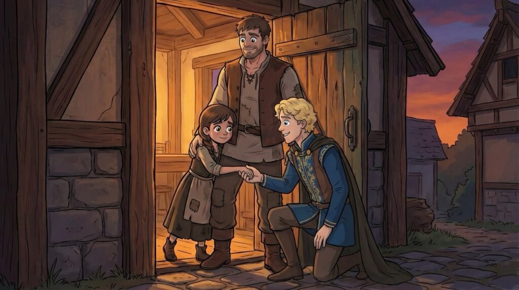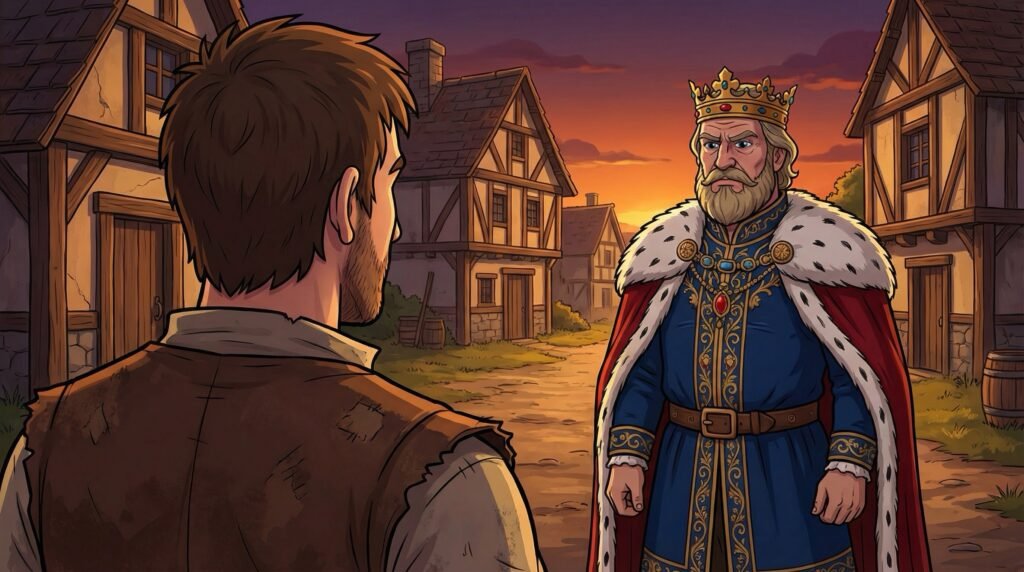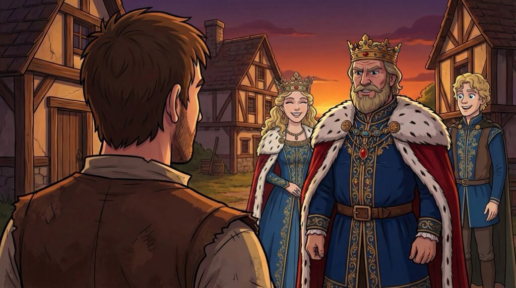 Al abrir la puerta, se encontró con el mismísimo Rey, quien lo observaba con una expresión severa pero curiosa. —¿Usted es Diego, el campesino? —preguntó el monarca con su voz profunda. Diego estaba temblando de miedo, temiendo que su incursión al castillo finalmente tuviera consecuencias legales, pero respondió con firmeza que sí. Fue entonces cuando vio a la Reina y al príncipe Agustín asomándose por detrás del hombro del Rey, ambos con una sonrisa que le devolvió la calma.