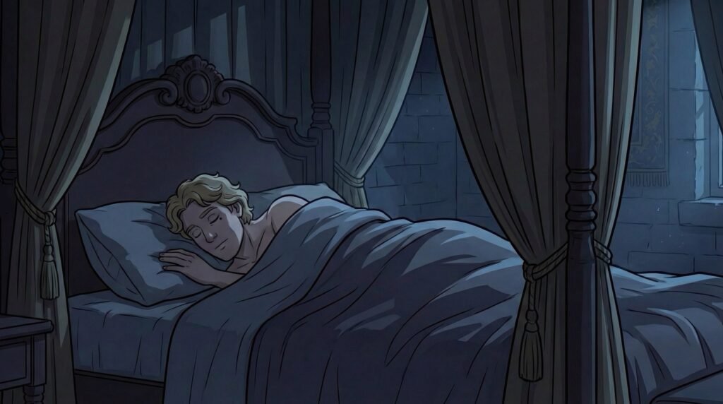 El príncipe Agustín era un joven de una belleza excepcional, casi irreal para los ojos de un hombre acostumbrado a la rudeza del campo. Bajo la luz plateada que se filtraba por los ventanales, su piel parecía de porcelana y su cabello rubio caía sobre la almohada con una suavidad que hipnotizó a Diego. Por un breve instante, el campesino olvidó su misión y el peligro que corría, quedando suspendido en el tiempo mientras observaba al príncipe, cuya vulnerabilidad al dormir lo hacía parecer menos un gobernante y más un ser humano.