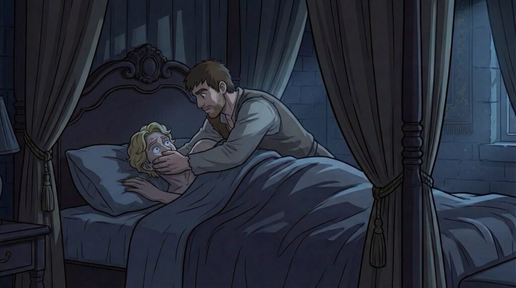 Al ver a un hombre desconocido, vestido con ropas humildes y manchadas de barro, el príncipe Agustín sintió que el terror le helaba la sangre y comenzó a abrir la boca para gritar pidiendo ayuda. Diego, viendo que su vida y su plan pendían de un hilo, actuó por puro instinto y se abalanzó sobre la cama. Con un movimiento rápido pero desesperado, tapó la boca del príncipe con su mano firme, intentando acallar el clamor que traería a toda la guardia real en cuestión de segundos.