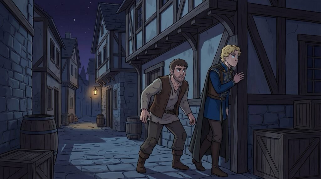 Recorrieron las calles del pueblo a oscuras, asegurándose de que nadie los viera y manteniéndose siempre pegados a las fachadas de las casas para evitar las pocas luces de las tabernas que aún seguían abiertas. El príncipe Agustín estaba particularmente ansioso; sus manos temblaban ligeramente y sus ojos se movían de un lado a otro con curiosidad y temor a partes iguales. Era la primera vez que recorría las calles de su reino solo, sin una escolta de soldados que le abriera paso y sin que nadie gritara su nombre o se arrodillara ante él.